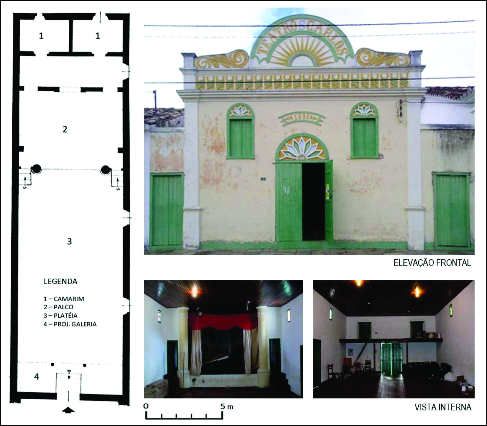 O Teatro São Carlos, foi construído em 1892 (AZEVEDO,1980) e possui planta em forma retangular, com cerca de 6 metros de largura. Possui cobertura em duas águas e sua fachada é emoldurada por cunhais e cornija, apresentando uma porta central e duas janelas altas com vergas retas e bandeiras falsas em arco pleno. Sobre a cornija há um friso decorado com motivos florais e uma platibanda em forma de frontão curvo, onde está gravado o nome do teatro. Seu interior é simples, formado por platéia, dois camarins e pequena galeria. O piso da platéia é plano e o do palco é curiosamente inclinado (Figura 18).